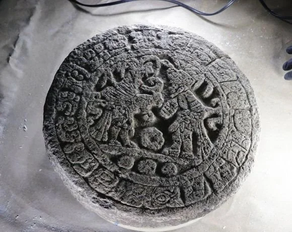 El valioso objeto de 32.5 centímetros de diámetro, 9.5 centímetros de grosor y 40 kilogramos de peso, fue hallado el pasado 18 de marzo, durante los trabajos arqueológicos que se efectúan como parte del Programa de Mejoramiento de Zonas Arqueológicas (Promeza), a cargo de la Secretaría de Cultura federal.