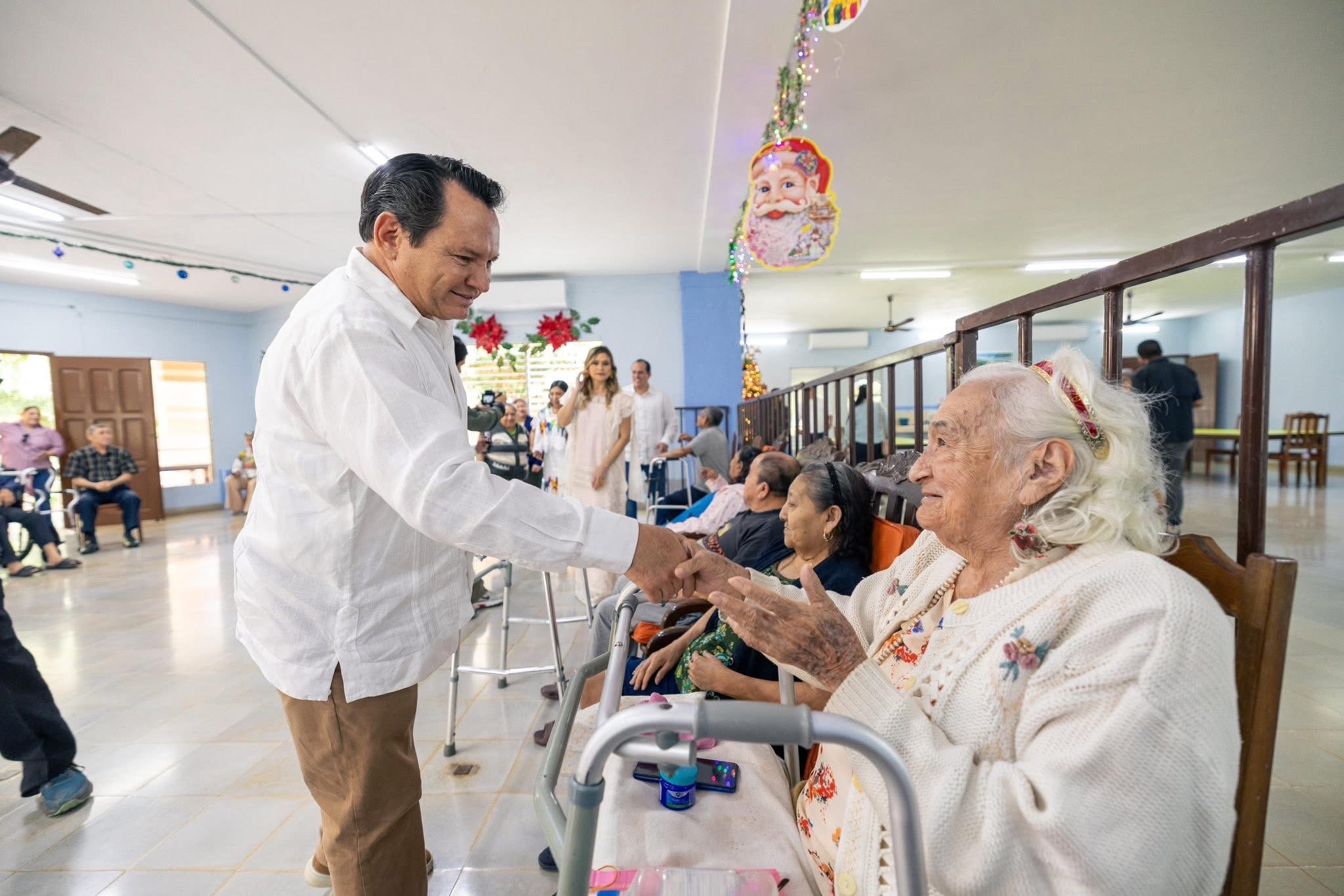 Antes de concluir su visita, Díaz Mena acudió a la Casa del Anciano Los Tres Reyes, donde conversó con los residentes y entregó 100 despensas y roscas de reyes para su disfrute.